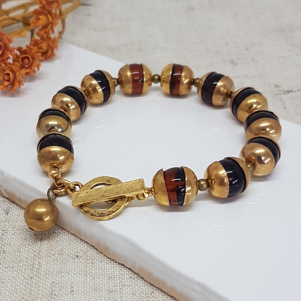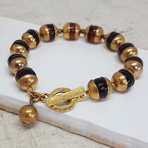 Bracelet comprising amber coloured glass and antique gold-plated beads, with complementary charm bead detail. The bracelet is finished with a simple gold-plated toggle clasp. Length 21cm. Packaged in a gift box or pouch.