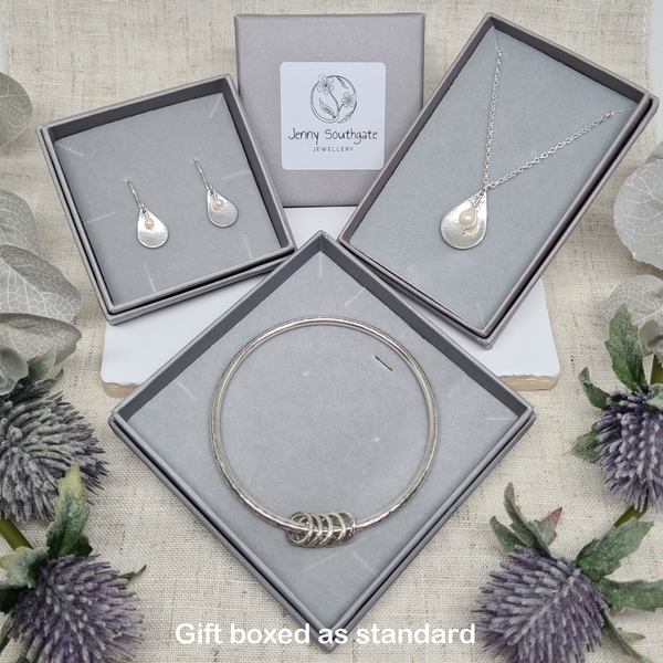 Handmade hammered sterling silver bangle with three silver charms: one with the initial of your choice; one with a crystal in the birthstone colour of your choice, and one star. The bangle is 2.5mm thick and has an inner diameter of approx 63-64mm; a full UK hallmark and is packaged in a gift box. Different sizes can be made to order - please contact me with your requirements. Please place your order and I will be in touch to confirm your initial and birthstone requirements. Please note this item is made to order so the delivery timescales will be longer than standard - please contact me for further details.